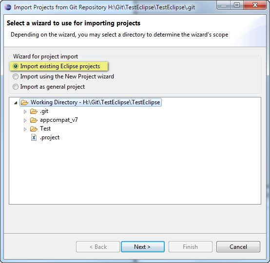 А сами файлы проекта, перекочевали из папки C:\EclipseWorkSpace в папку Git C:\Git\Eclipse\TestEclipse